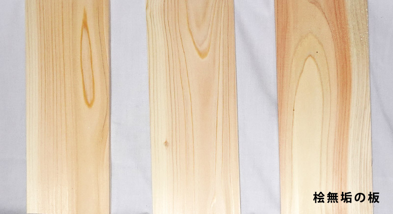 ヒノキは、淡いピンク系の色合いのものが多いですが、濃いピンクのものもあります。白辺は、白いので幅の狭い板に加工すると白色のみになる場合もあります。