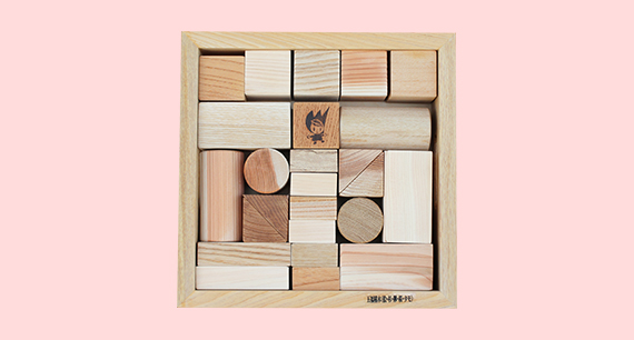 杉、ヒノキ、タモ、桜、欅(ケヤキ)の5種で作った積み木です。個性豊かな木の色合いが素敵な一品です。